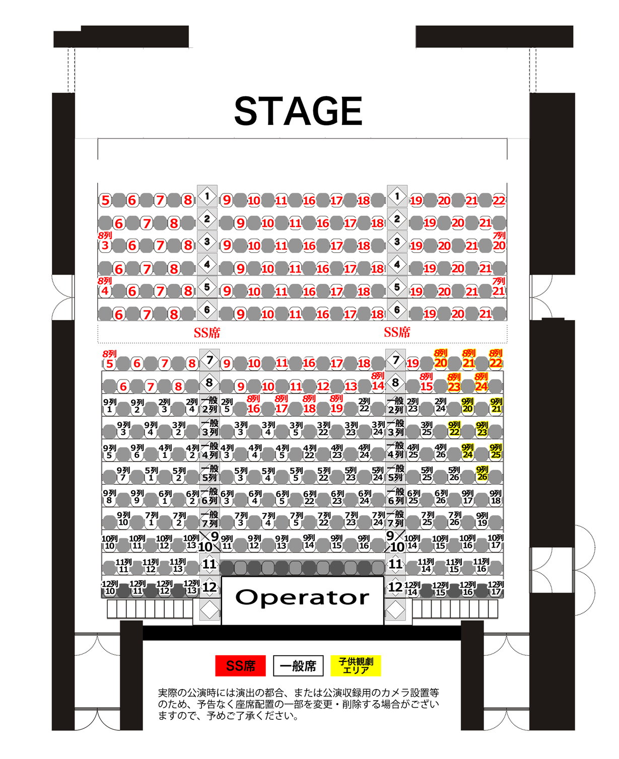実際の公演時には演出の都合、または公演収録用のカメラ設置等のため、予告なく座席配置の一部を変更・削除する場合がございますので、予めご了承ください